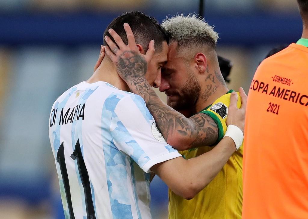 教练,队友维尼修斯、埃莫森、热苏斯及对手阿根廷中场帕雷德斯先后上前安慰内马尔。赛后作为失利者的内马尔,尽管伤心地留下眼泪,但他依然主动走到梅西面前,大度为他送上夺冠道贺,两人深情相拥许久。