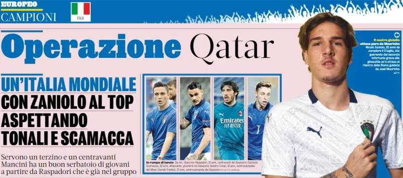 意大利《米兰体育报》预测了意大利出征卡塔尔世界杯的阵容:罗马天才攻击手扎尼奥洛领衔众多青年才俊上位。