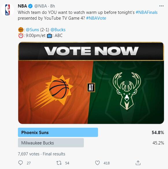 雄鹿与太阳G4赛前,NBA官方发起了一项投票,G4一战你们支持谁?太阳得到了54.8%的投票率,雄鹿得到45.2%的投票率。看起来还是多数人希望太阳在雄鹿主场拿到一场胜利,那样太阳几乎就坐定2021年的冠军了。首节打完太阳23-20领先3分。