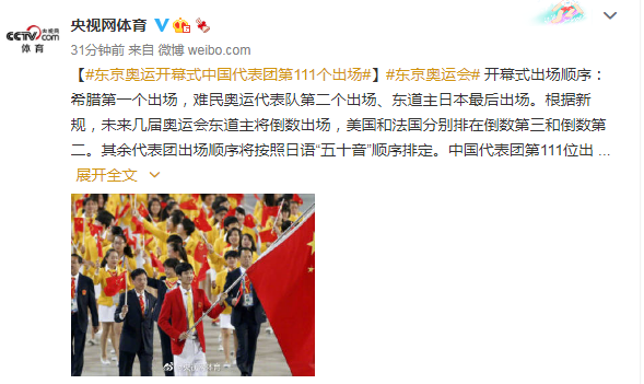 根据新规,未来几届奥运会东道主将倒数出场,美国和法国分别排在倒数第三和倒数第二。其余代表团出场顺序将按照日语“五十音”顺序排定。中国代表团第111位出场。