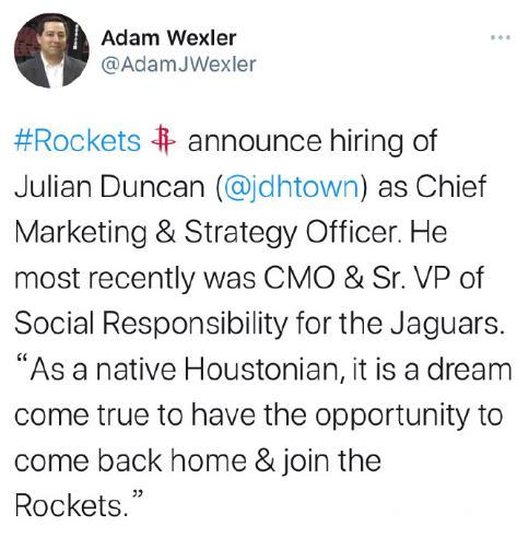 朱利安-邓肯成为了火箭队的“首席营销和战略官”。在成功加入火箭队管理层之后,朱利安-邓肯也表示:“作为一个土生土长的休斯顿人,有机会回家并加入火箭队阵营令我梦想成真!”