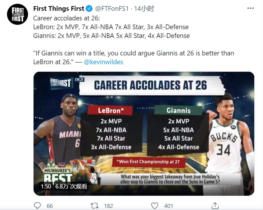 对此,《First Things First》节目主持人Kevin Wildes列举了26岁的字母哥和詹姆斯所获得的荣誉,断言若在今年夺冠,26岁的字母哥会强于同年龄段的詹姆斯。