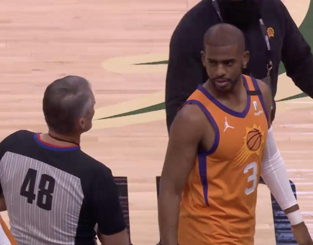 克里斯-保罗在比赛中和主裁判斯科特-福斯特交流。