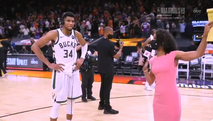 赛后字母哥接受场边采访,提到还差一胜拿到生涯首冠,他说:“我们会保持冷静,保持战斗,这是NBA总决赛,所以你必须倾尽全力,这是今晚球队所做的。”