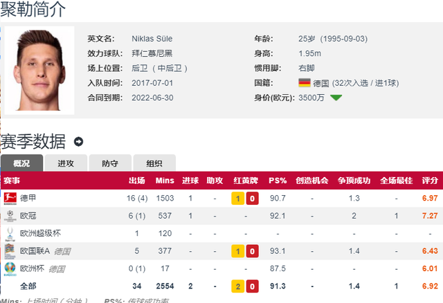 现年25岁的聚勒,上赛季一共为球队出战了20场德甲的比赛,其中16场首发,打入了1个进球;并出战了7场欧冠的比赛,其中6场首发,打入了1个进球。聚勒与拜仁仅剩下1年合同,目前球员在德转的身价为3500万欧元。