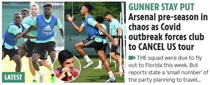 据英国媒体《太阳报》报道,阿森纳队内出现疫情感染,球队已经取消了前往美国踢热身赛的计划。