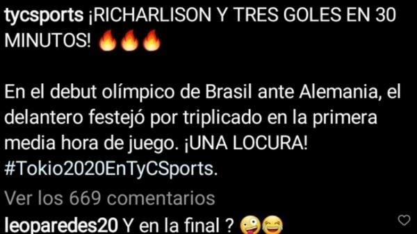 阿根廷TYC体育写道:“里查利森30分钟内打入3球!在奥运会首秀中,巴西前锋半个小时就上演帽子戏法,太疯狂了。”