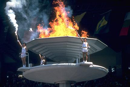 1988年汉城奥运会,圣火首次由三人共同点燃。新华社记者 官天一摄