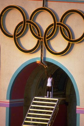 1984年洛杉矶奥运会,在开幕式最后的点火环节,奥运会十项全能冠军约翰逊举着火炬爬上“天梯”,点燃五环形状的火炬塔,惊艳了世人。从此奥运会的点火仪式成为一个精心设计的环节,每一届以何种方式点火备受人们期待。