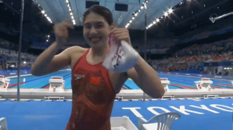 赛后出水后,张雨霏对着镜头庆祝,双手握拳大喊了一声“加油!”。