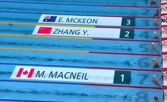 不过在100米蝶泳上,她旁边泳道的澳大利亚选手麦基翁,同样也是世界顶级的选手,也是张雨霏最大的挑战者,在预赛中,她游出了和张雨霏一样的55.82!