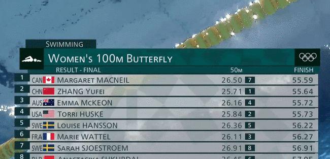 在前面的50米,张雨霏还是第一名,结果到了后面的50米,加拿大的选手玛吉·麦克尼尔速度非常快,游出了55秒59,拿到最后的金牌,而张雨霏游出了55秒64,无缘最终的金牌,屈居银牌。仅仅差了0.05秒!