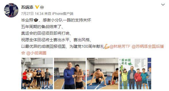 并表示:“毕业照、感谢小分队一路的支持关怀,五年周期的备战结束了、奥运会的田径项目即将打响、祝愿全体田径将士赛出水平、赛出风格、以最优异的成绩回报祖国、为建党100周年献礼”