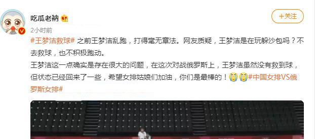这场比赛的赛后女排自由人王梦洁再度被喷,有人表示王梦洁乱跑,打得毫无章法,王梦洁还躲一传,也不去救球,王梦洁存在很大的问题。但打俄罗斯这场比赛王梦洁真的不该背锅,她已经很努力了。