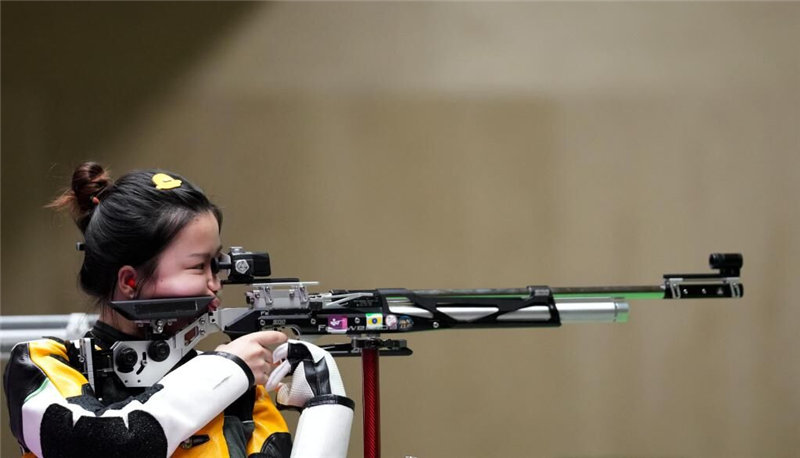 7月24日,杨倩在比赛中。当日,在东京奥运会射击女子10米气步枪决赛中,中国选手杨倩夺冠,赢得东京奥运会首枚金牌。华社记者鞠焕宗摄