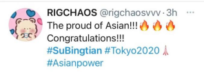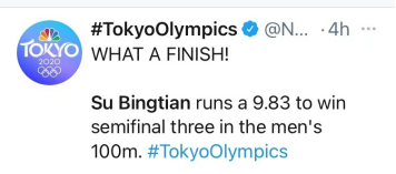 在苏炳添半决赛以9秒83的成绩进入决赛后,美国全国广播公司(NBC)的奥运报道账号在推特上感叹:“多棒的收尾!苏炳添跑出9.83秒的成绩赢得男子100米半决赛。”