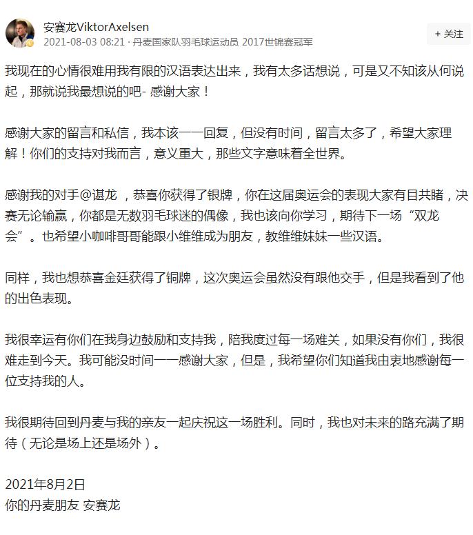 8月3日,在东京奥运会羽毛球男单决赛中战胜中国选手谌龙的丹麦选手安赛龙,在中国社交媒体用中文发文: