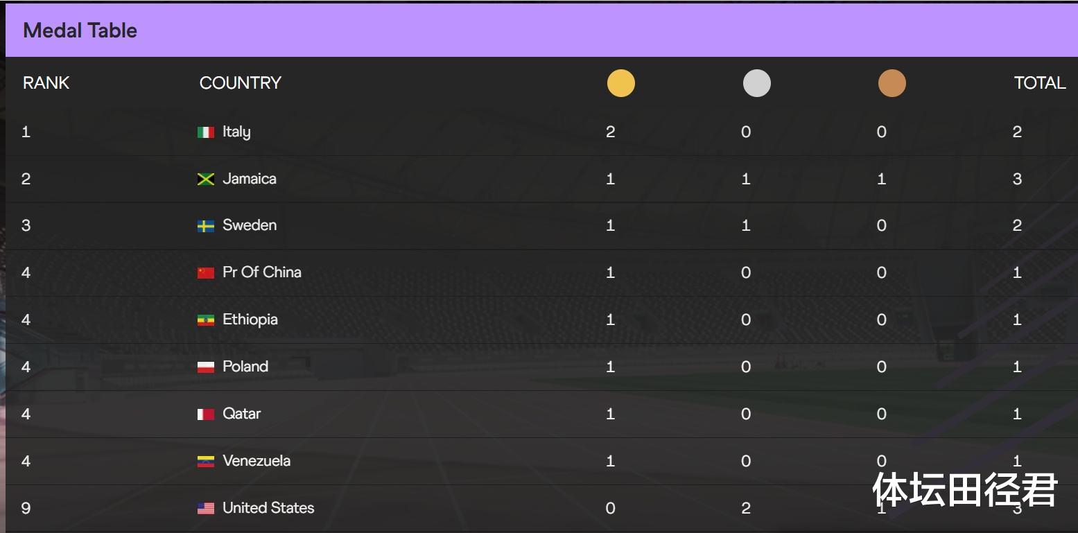 北京时间8月1日晚,东京奥运田径结束第三个比赛日,该日诞生四金,中国巩立姣斩获女子铅球金牌,这是中国田径奥运首金,在最新的田径金牌榜,中国队以1金名列第四,美国队在男女4×400米接力、男100米、男子跳高、女子铅球等项目失手,至今还未夺得1枚金牌,以2银1铜排名第九,意大利拿下男子100米和跳高双金,排名第一位。
