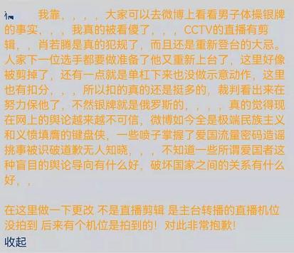 这两件事情发生后,全网吐槽比赛的不公正,网友纷纷为本国选手发声,网上一片不鸣之声。但在今天,有网友在某社交平台上针对第一件事发表言论称“肖若腾是真的犯规了”,并有人针对这一言论去翻出了比赛的原视频,称其实按照比赛规则,肖若腾赛后穿拖鞋返回赛场致意一共要扣三项规则分,第一项是没有向裁判致意,第二项是在完成动作后再次返回赛场,第三项是着装不规范,所以一共加起来应当扣0.9分。