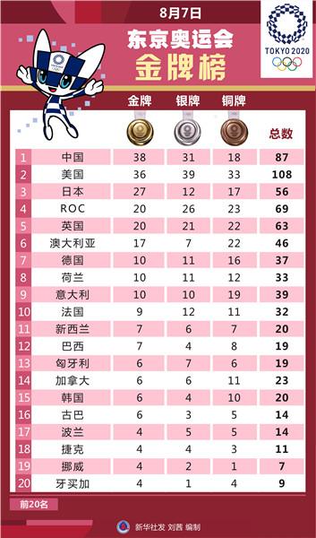 图说:8月7日东京奥运会金牌榜 新华社图(下同)