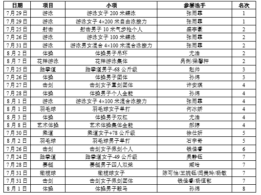 游泳项目的张雨霏1人获得2金、2银和1个第四名,成为本届奥运会中国体育代表团获得奖牌最多的运动员。她在女子蝶泳200米决赛中夺冠并打破奥运会纪录,与队友团结合作获得女子自由泳4×200米决赛金牌并打破世界纪录。