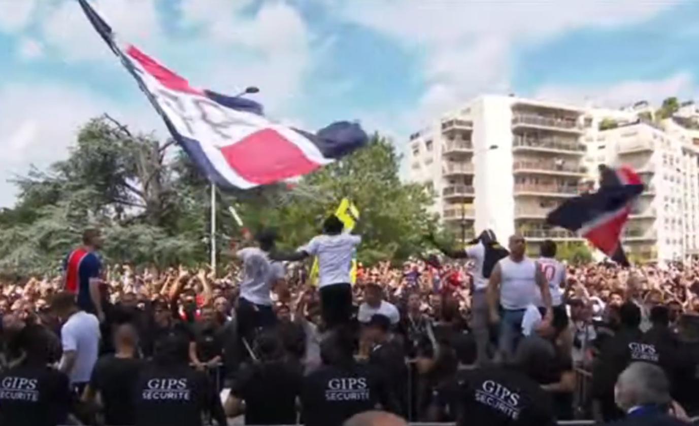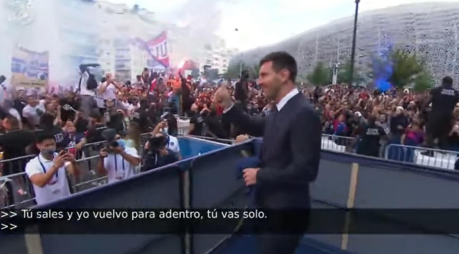 在随后,梅西也是终于亮相了巴黎的主场,在巴黎的主场中,数万名球迷聚集在一起,一起高呼:梅西!(后面的法语,我也听不太懂)并且球迷又和昨天迎接梅西一样,他们再次放起了烟花庆祝,到处都是烟雾,并且挥舞着巴黎圣日耳曼的旗帜!