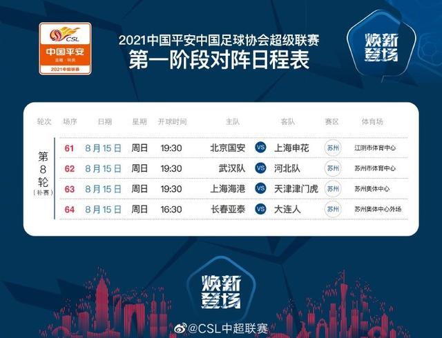 北京时间8月13日,中超联赛官方公布了苏州赛区第8轮补赛的开赛时间,开赛日期为8月15日,其中涉及到争冠组名额归属的3场比赛,北京国安vs上海申花,以及武汉队和河北队的比赛均在19:30开球。