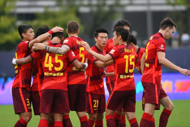 8月12日,河北队球员在比赛中庆祝进球。图片来自新华社