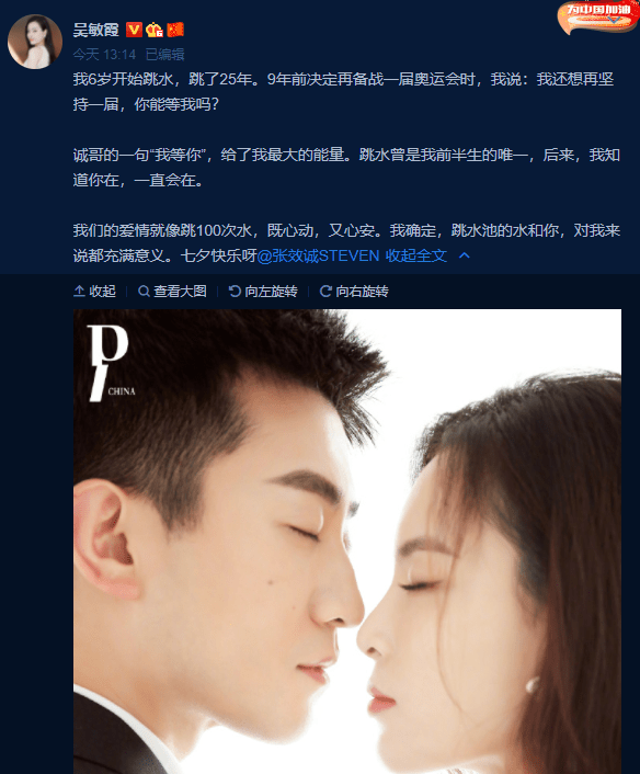 表示“我们的爱情就像跳100次水,既心动,又心安。”