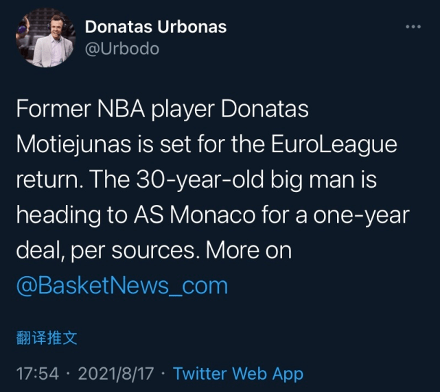 立陶宛媒体报道,前NBA球员莫泰尤纳斯确定回归欧洲联赛,他将与法甲摩纳哥队签订为期一年的合同。