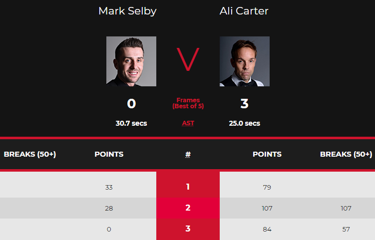 特鲁姆普打出单杆75分、69分、65分3-1轻取宾汉姆,机长卡特轰出单杆107分、57分3-0横扫塞尔比,乔.奥康纳打出单杆71分、67分、55分、51分3-1淘汰达赫迪,加里.威尔逊没有打出单杆50+,但还是3-0完胜亨得利,四位前世锦赛冠军得主,都在这一轮输球被淘汰出局。