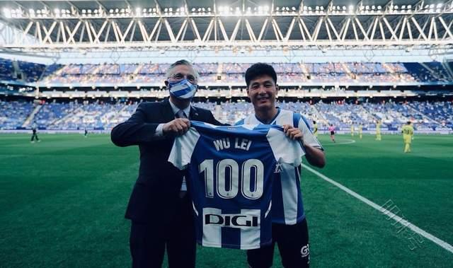 赛前,西班牙人举办了简短的仪式,纪念武磊为球队征战一百场。俱乐部高层向武磊赠送了印有“100”字样的纪念版球衣,武磊喜笑颜开,接受全场球迷们的掌声。