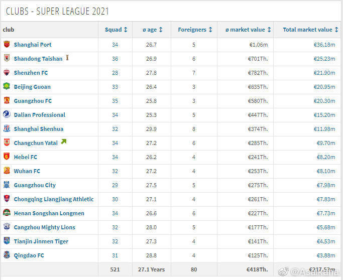《转会市场》中国区管理员朱艺发布了中超联赛此次身价更新后的俱乐部总身价表。目前,上海海港(3618万欧)、山东泰山(2523万欧)、深圳(2190万欧)分列前三位,垫底的是青岛队(388万欧)。
