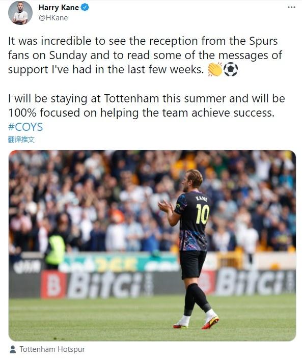 周三,托特纳姆热刺前锋凯恩宣布将留队