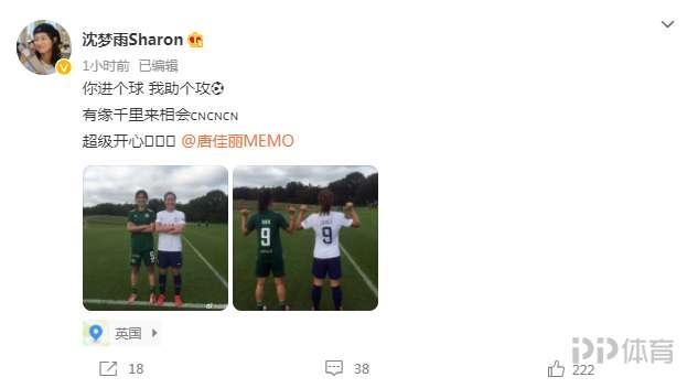 沈梦雨写道:“你进个球,我助个攻,有缘千里来相会,超级开心”