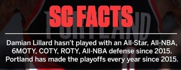 ESPN写道:“从2015年开始,利拉德就没有搭档过(当赛季的)全明星、最佳阵容、最佳第六人、最佳教练、最佳防守阵容球员,但他每一年都打进了季后赛。”