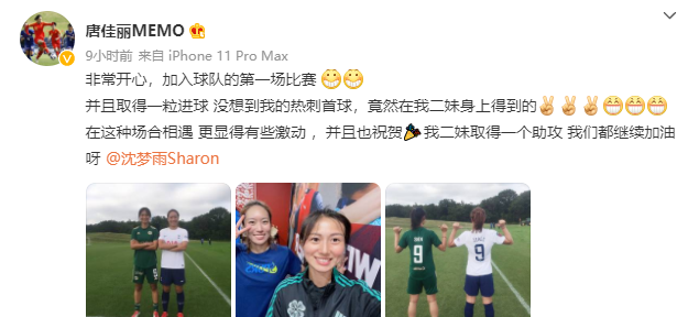赛后,唐佳丽就在社交平台写道:非常开心,加入球队的第一场比赛 。并且取得一粒进球,没想到我的热刺首球,竟然在我二妹身上得到的。而沈梦雨也作出回应:你进个球 我助个攻,有缘千里来相会。