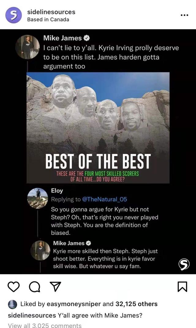 今天美媒体列举了NBA四大得分高手,分别是詹姆斯,乔丹,科比和杜兰特,就按照过去多年四人的表现来看他们排在这个榜单也没问题,但是库里却意外背锅。前篮网球员迈克詹姆斯对于美媒的评选做出了评论,他表示:“凯里欧文的进攻非常出色,他应该名列其中的,他有这样的实力。”