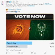 雄鹿与太阳G4赛前,NBA官方发起了一项投票,G4一战你们支持谁?太阳得到了54.8%的投票率,雄鹿得到45.2%的投票率。看起来还是多数人希望太阳在雄鹿主场拿到一场胜利,那样太阳几乎