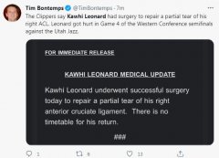 7月14日,根据NBA名记查拉尼亚的消息科怀-莱昂纳德接受了前交叉韧带修复手术,他没有确定的恢复时间表,他是在西部半决赛G4中遭遇的膝伤,但快船官方当时只是曝出小卡右膝损伤。