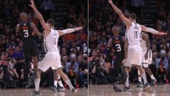 在昨日总决赛太阳对阵雄鹿的第一场比赛的第三节,保罗面对大洛佩斯后撤步三分投篮,大洛佩斯的脚向前伸了一大步,恰好落在了保罗的脚底,致使后者脚踝轻微扭伤,裁判在回看了