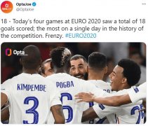 据OPTA数据统计,今天4场欧洲杯比赛共轰入18个进球,创造欧洲杯历史单个比赛日的进球纪录。 今天凌晨的4场欧洲杯均踢出了大比分,瑞典3-2绝杀波兰,西班牙5-0屠杀斯洛伐克,法国
