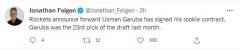 北京时间8月17日,《休斯顿纪事报》记者乔纳森-费根报道,火箭队已经与23号秀乌斯曼-加鲁巴完成签约,这份签约合同是一份新秀合同但年限还没有曝光。 火箭队已经在官方推特上祝
