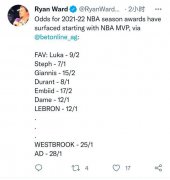 着手为下赛季做准备。湖人记者Ryan Ward发推总结了博彩机构BetOnline刚刚发布的2021-22赛季MVP奖得主的赔率分布情况。 最受看好的人选如下: 卢卡-东契奇 赔率9/2 斯蒂芬-库里 赔率7/1 扬尼