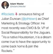 朱利安-邓肯成为了火箭队的首席营销和战略官。在成功加入火箭队管理层之后,朱利安-邓肯也表示:作为一个土生土长的休斯顿人,有机会回家并加入火箭队阵营令我梦想成真! 可以