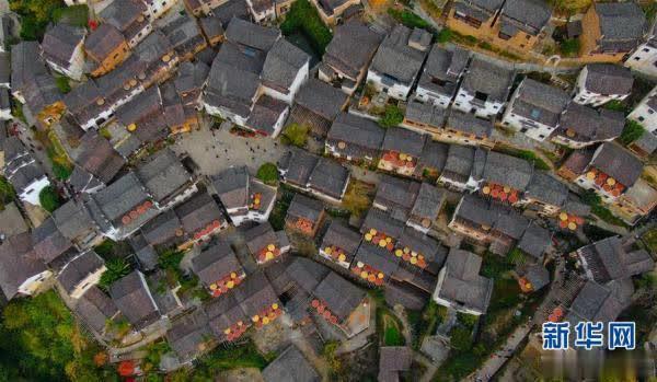 这是婺源县江湾镇篁岭村的晒秋景象(11月7日无人机拍摄)。新华社记者 胡晨欢摄