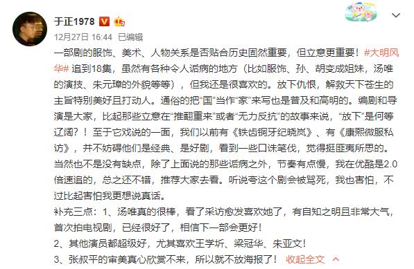 12月27日,于正发文对《大明风华》做出评价,说道一部剧的服饰和美术相当重要,同时对汤唯、王学圻、朱亚文和梁冠华的演技称赞不已,而对这部剧的服装师张叔平进行吐槽,说欣赏不来他的审美观。说起张叔平,也许大多数网友并不熟悉。他是王家卫的御用摄影师,《重庆森林》、《旺角卡门》和《东邪西毒》等服装设计,全是出自张叔平之手。艺术性极高、堪称世界之最的《花样年华》,也是张叔平的作品之一。张曼玉身穿旗袍,曼妙多姿的模样,其中有一份张叔平的功劳。