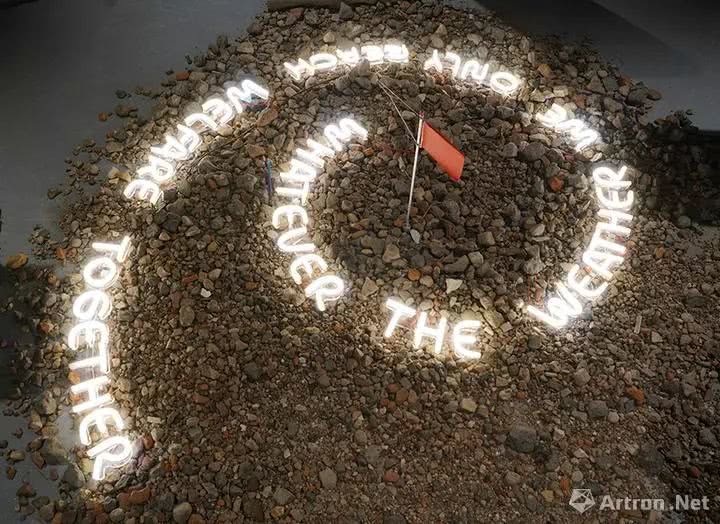 之后,郭城将一些挖掘成果作为材料,创作成了装置。如将清理的部分石块,与《马歇尔计划》系列海报中的一幅标语“Whatever the weather,we only reach welfare together”(无论天气如何,我们总会到达幸福)并制成霓虹灯装置,作品想表说,即当我们以非人类中心的眼光看待世界,而以地球、环境作为主体时,这种“幸福”的必要性或者说有效性是否还存在呢?