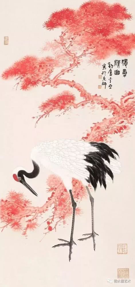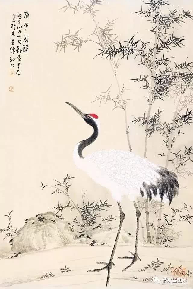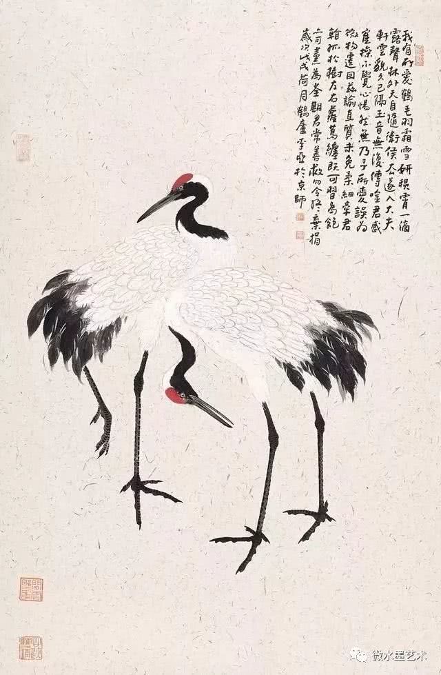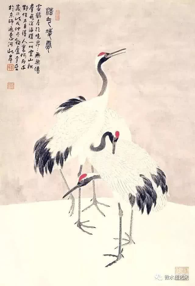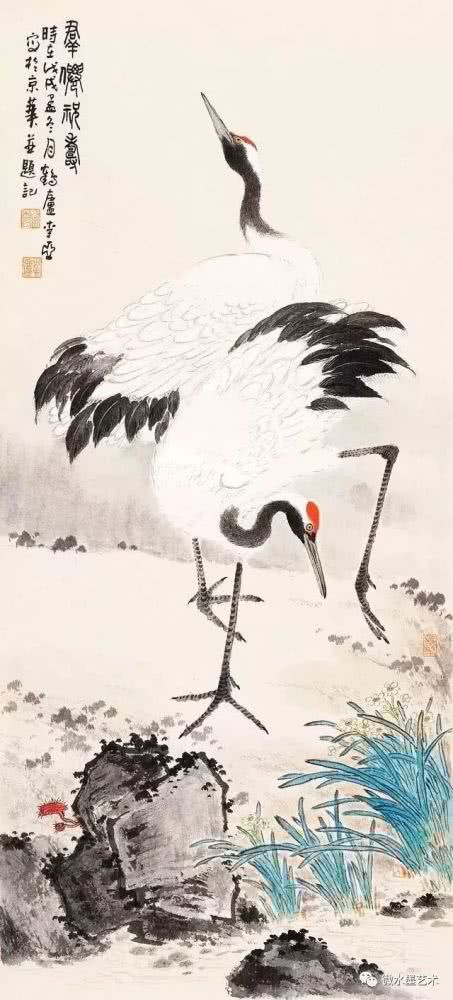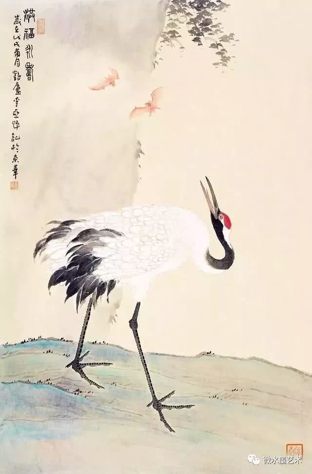 仙鹤也是画家们很喜爱表现的题材,这不仅是对仙鹤优美体态及高雅情趣的赞美和表现,更是将其与长寿、贺寿等美好寓意联系在一起,表达画者对人生及美好事物向往的一种崇高体现。