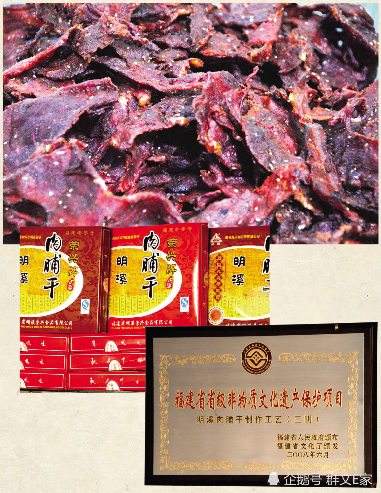 明溪肉脯干制作工艺始于明朝的客家风味食品,距今已有600多年的历史,驰名海内外,被誉为“闽西八大干之首”。明溪肉脯干的制作工艺复杂而有科学性,通过削片、腌制、炭火烘烤等传统工艺结合现代科学技术精制而成,具有色泽红润、剔透、酥爽、鲜香、味美等特点。该项目2007年入选第二批省级非物质文化遗产名录。